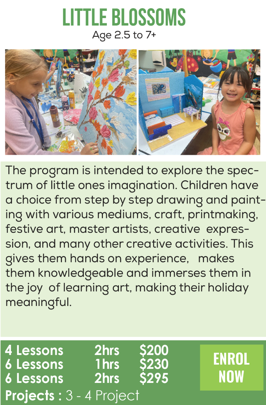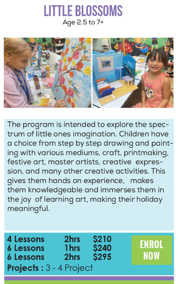 By starting early – even at 2.5yrs –children have more time to explore their creativity without inhibitions. Those who start early in our studio generally realize their potential is much more. Give yourself or your child an opportunity to discover the best art classes (online and offline), holiday programs, camps, and events at Little Artist’s Art Studio. With a premier range of programs offered year-round for ages 2.5 to 17 years and adults, there’s something to ignite the passion of every emerging artist in Singapore, from our Little Blossoms program to our Budding Artists Program.